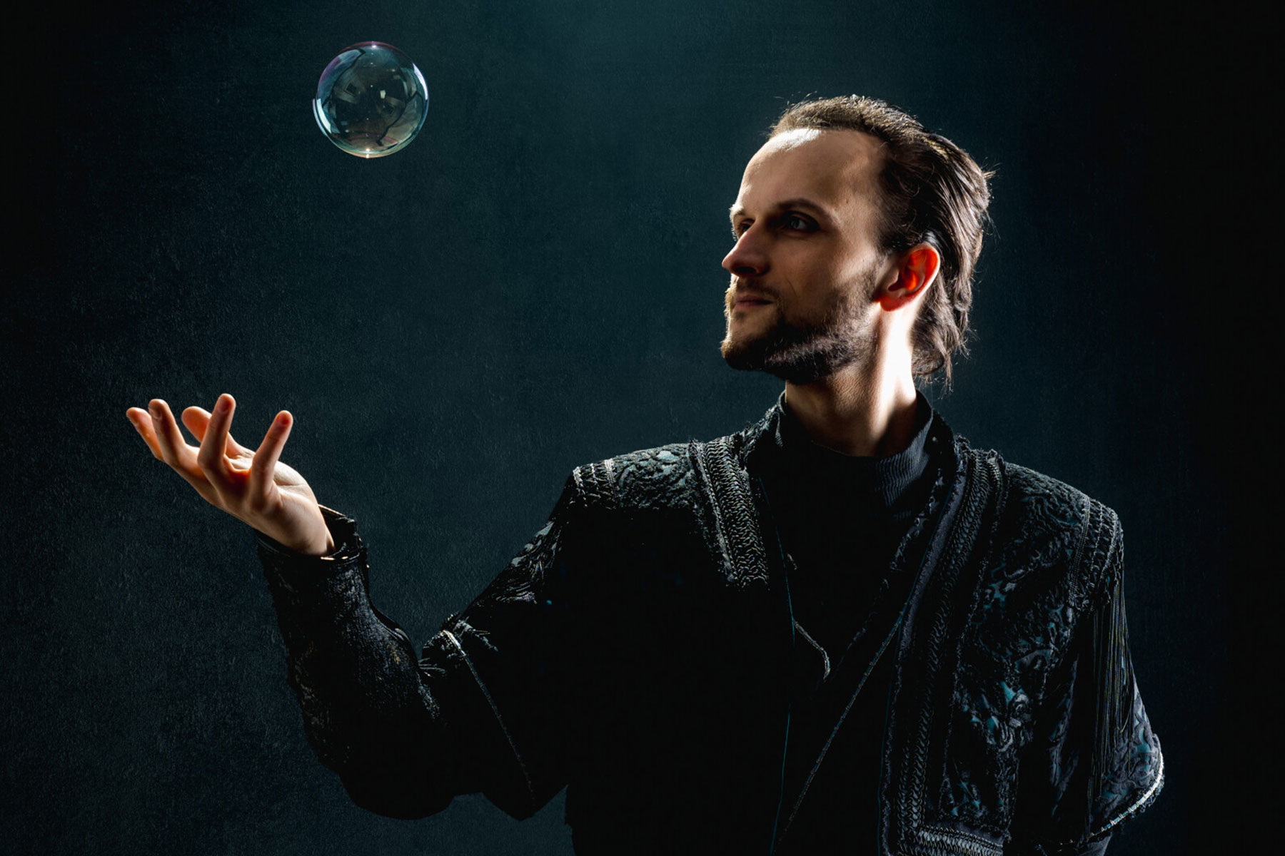 This mysterious character creates a magical bond with the most fragile Object in the World, a Soap Bubble. The Act tells an emotional und poetic story about a peaceful Warrior facing the fear of letting go. A wonderful color to add to your evening gala or cabaret.